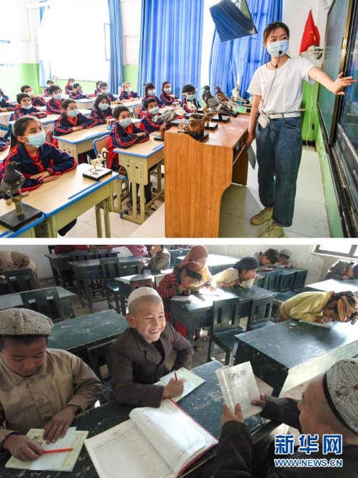 拼版照片:上圖為2020年5月16日,在地處塔克拉瑪干沙漠腹地的新疆和田縣塔瓦庫勒鄉(xiāng)巴克墩小學(xué),支教老師在給學(xué)生講解科普知識(新華社記者 王菲 攝);下圖為2005年11月7日,新疆于田縣達(dá)里雅布依鄉(xiāng)寄宿學(xué)校的孩子們在上自習(xí)課(資料照片)。新華社發(fā)