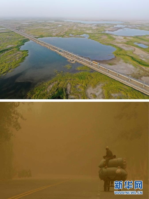 拼版照片:上圖為2020年7月16日拍攝的臺特瑪湖特大橋。臺特瑪湖位于新疆塔里木盆地東南部、若羌縣北部,是我國最長的內(nèi)陸河塔里木河的終點湖。近年來,新疆實施大范圍生態(tài)輸水,進(jìn)一步鞏固了塔里木河流域生態(tài)治理成果(無人機照片,新華社記者 丁磊 攝);下圖為2007年5月8日,新疆和田地區(qū)策勒縣的維吾爾族農(nóng)民趕著毛驢車在沙塵天氣中趕路(新華社記者 沈橋 攝)。新華社發(fā)