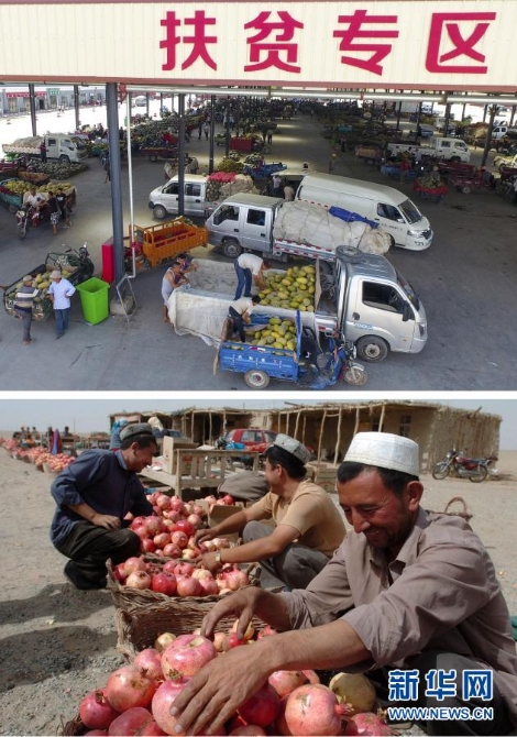 拼版照片:上圖為2019年8月10日拍攝的新疆果品(伽師)批發(fā)交易市場扶貧專區(qū)。為貧困戶設(shè)立的扶貧專區(qū)占市場面積的三分之二,瓜農(nóng)可以在扶貧專區(qū)免費交易(無人機照片,新華社記者 丁磊 攝);下圖為2004年9月22日,在新疆和田地區(qū)皮山縣皮亞勒瑪鄉(xiāng),當(dāng)?shù)剞r(nóng)民在路旁推銷自家的石榴(新華社記者 羅曉光 攝)。新華社發(fā)