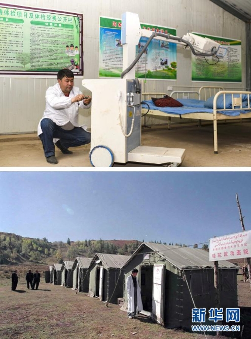 拼版照片:上圖為2020年5月1日,在新疆葉城縣西合休鄉(xiāng)亞爾阿格孜村衛(wèi)生室,鄉(xiāng)衛(wèi)生院醫(yī)生買提托合提·依明在修理醫(yī)療設(shè)備(新華社記者 胡虎虎 攝);下圖為1999年拍攝的設(shè)在新疆阿勒泰草原上的駱駝醫(yī)院。牧民的氈房搬到哪里,醫(yī)院就搬到哪里(新華社記者 薛永興 攝)。新華社發(fā)