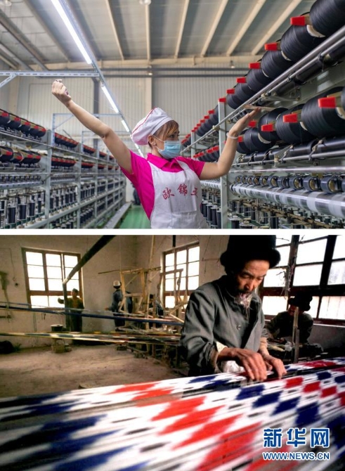 拼版照片:上圖為2020年9月20日,在位于新疆和田地區(qū)策勒縣天津工業(yè)園區(qū)內(nèi)的一家紡織企業(yè)車間,33歲的阿麗屯古麗·圖爾蓀在生產(chǎn)線上忙碌(新華社記者 胡虎虎 攝);下圖為2001年,新疆洛浦縣吉亞鄉(xiāng)一家紡織廠的工人在生產(chǎn)車間忙碌(新華社記者 沈橋 攝)。新華社發(fā)