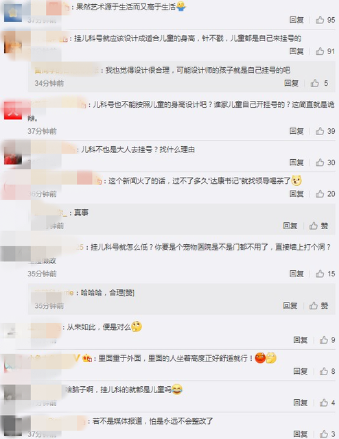 宣威市第二人民醫(yī)院出現(xiàn)“丁義珍式窗口”一事被傳開后,引起了網(wǎng)民的關(guān)注。對此有網(wǎng)友表示:“果然藝術(shù)源于生活而又高于生活?!币灿芯W(wǎng)友調(diào)侃:“掛兒科號就應(yīng)該設(shè)計(jì)成適合兒童的身高,兒童都是自己來掛號的?你要是個(gè)寵物醫(yī)院是不是門都不用了,直接墻上打個(gè)洞?”