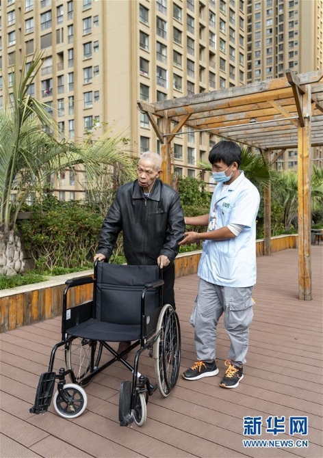 11月7日,昆明市官渡區(qū)養(yǎng)老綜合服務(wù)示范中心工作人員在陪老人散步。新華社發(fā)(陳欣波/ 攝)