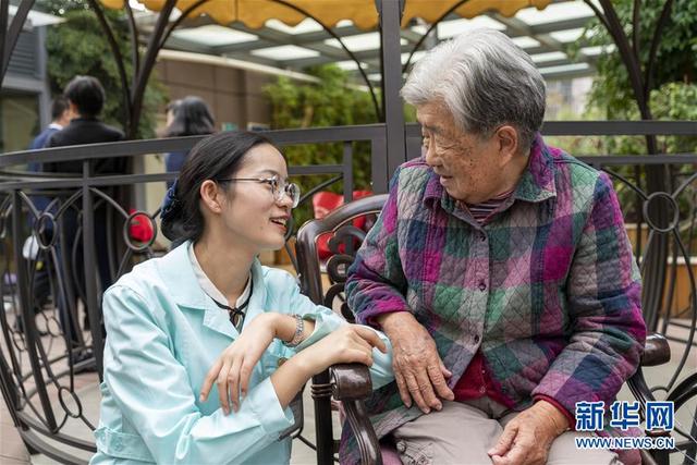 11月7日,昆明市官渡區(qū)養(yǎng)老綜合服務(wù)示范中心護(hù)理部主任楊嬌蓉(左)在陪老人聊天。新華社發(fā)(陳欣波/攝)