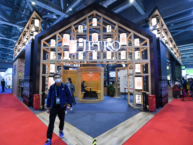 11月10日,觀眾從第三屆進(jìn)博會食品及農(nóng)產(chǎn)品展區(qū)日本貿(mào)易振興機(jī)構(gòu)展臺走出。(新華社記者陳曄華攝)