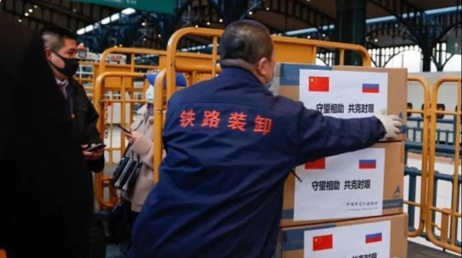 用中文和俄語(yǔ)寫著“病毒必將被擊敗,勝利屬于我們!”標(biāo)語(yǔ)的醫(yī)療物資多次從中國(guó)運(yùn)往俄羅斯。