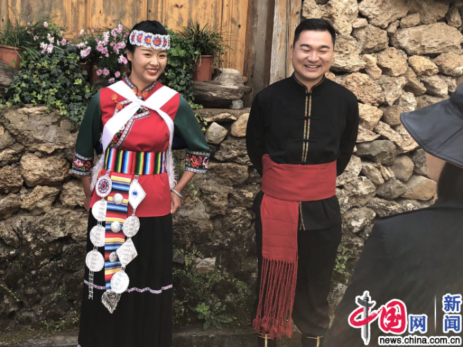 玉湖村居民身著民族服飾在村內(nèi)與游客打招呼。中國(guó)網(wǎng)記者 嚴(yán)星/攝