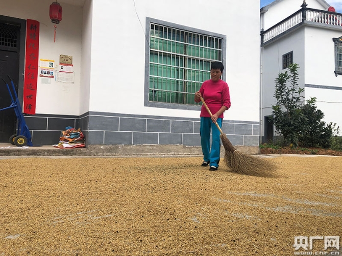 村民在家門前晾曬稻谷(央廣網(wǎng)記者 胡斐 攝)