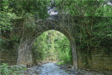 庚子年的某一時間段,鄧耳村的弟兄憨濤和老黑自告奮勇給我當向導,出村不遠處,循著當年趕馬人用生命踏出的陡峭山路,披荊斬棘,徐徐探入谷底,眼見小河及石拱橋。河床不寬,沿岸邊涉水從上游往下游探尋,越往下游水流越湍急。石拱橋青石壘砌而成,佇立在密林深處,石拱橋四周荊棘纏繞,垂蔭浮翠,巍然屹立,從下往上看,氣勢恢宏。橋的周圍有斷垣殘壁,人工壘砌的灶臺、石砌窩棚等依稀可辨。此行艱難,但仿佛撿拾到了時光塵埃中的歷史瑰寶和文明碎片,感覺馬幫就在不遠處。