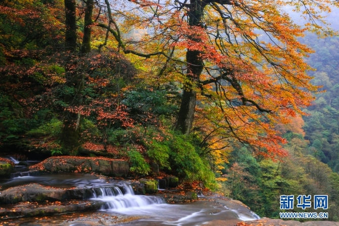 紅葉下的迎客瀑布景。(新華網(wǎng) 左濱洪/攝)
