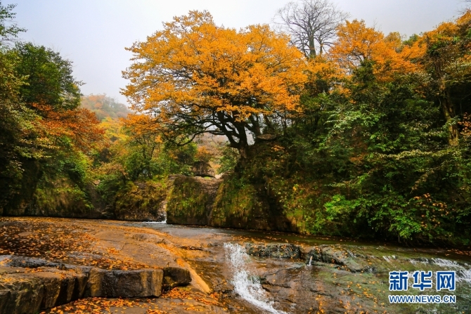 金黃樹葉與溪水構(gòu)成一幅美麗畫卷。(新華網(wǎng) 左濱洪/攝)