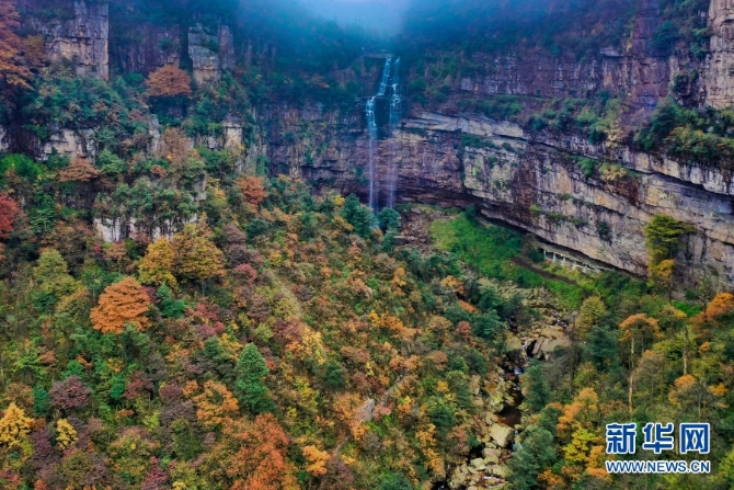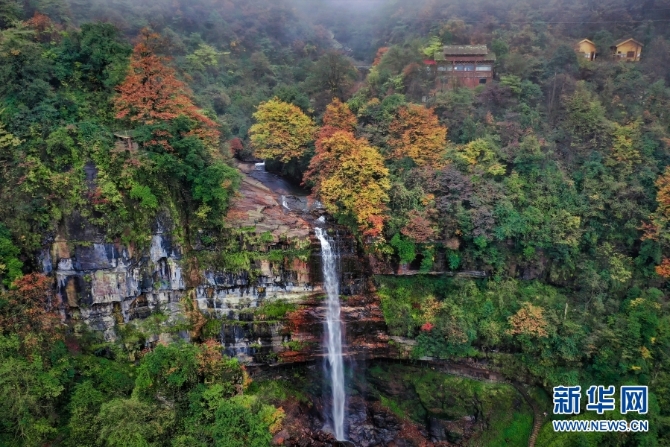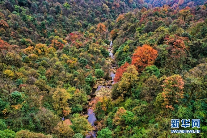 五彩斑斕、層林盡染的小草壩。(新華網(wǎng) 左濱洪/攝)