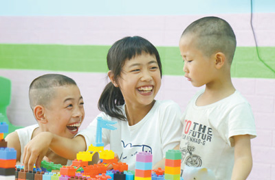 不遠(yuǎn)處,“兒童空間”的房子里,游戲玩得正酣:12個小孩子,手拉手坐成一圈,把輔導(dǎo)員陳梅圍在正中間。仔細(xì)打量,這個“兒童空間”分為兩部分,進(jìn)門是游樂區(qū),里間是學(xué)習(xí)區(qū),課桌、書架一應(yīng)俱全。