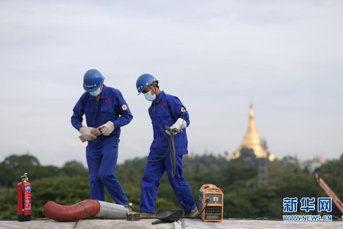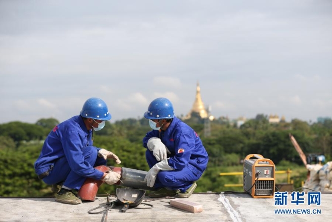 10月28日,在緬甸仰光的國家劇院維修改造項(xiàng)目現(xiàn)場,覺泰昂在師父的指導(dǎo)下焊接鋼管。新華社發(fā)(吳昂攝)