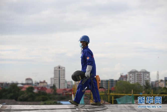 10月28日,在緬甸仰光的國家劇院維修改造項(xiàng)目現(xiàn)場,覺泰昂提著電焊工具從屋頂走過。新華社發(fā)(吳昂攝)