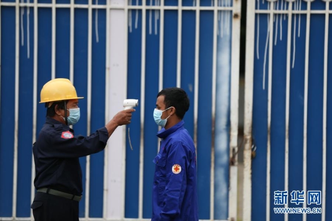 10月28日,在緬甸仰光的國家劇院維修改造項(xiàng)目現(xiàn)場,準(zhǔn)備上班的覺泰昂(右)接受體溫測量。新華社發(fā)(吳昂攝)