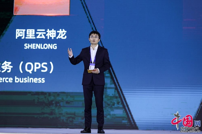 阿里巴巴集團合伙人、阿里云基礎產品總經理蔣江偉發(fā)布領先科技成果,神龍:新一代軟硬一體化虛擬化技術架構。中國網記者 董寧 攝影