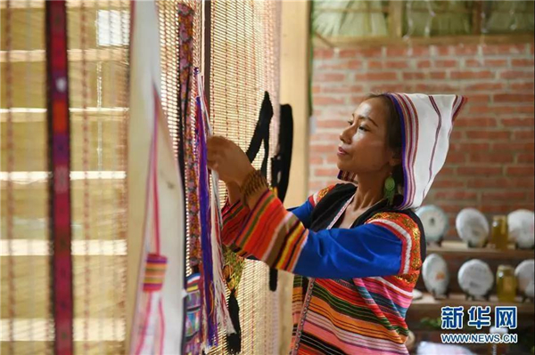 景洪市基諾山基諾族鄉(xiāng)巴飄村村民姿梅在整理出售的傳統(tǒng)手工織物(2019年6月10日)。新華社記者 秦晴 攝
