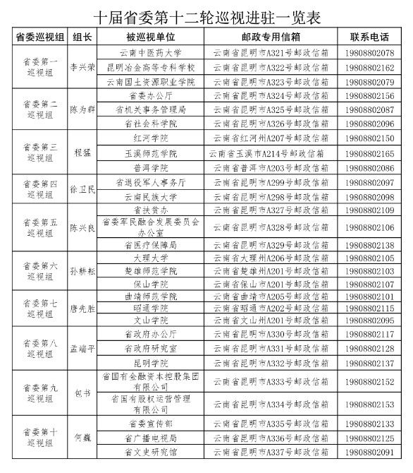 經(jīng)省委批準,本輪巡視分別對省委辦公廳(含云南聯(lián)云集團有限責任公司)、省委宣傳部、省委軍民融合發(fā)展委員會辦公室(含云南省戎合投資控股有限公司)、省政府辦公廳、省退役軍人事務廳、省政府研究室、省廣播電視局、省機關(guān)事務管理局(含云南云勤服務集團有限責任公司)、省扶貧辦、省醫(yī)療保障局、省社會科學院、省文史研究館12個省直部門(單位),云南中醫(yī)藥大學、云南民族大學、昆明學院、昆明冶金高等專科學校、云南國土資源職業(yè)學院、昭通學院、曲靖師范學院、玉溪師范學院、保山學院、楚雄師范學院、紅河學院、文山學院、普洱學院、大理大學14所高等院校,省國有金融資本控股集團有限公司、省國有股權(quán)運營管理有限公司2戶省屬國有企業(yè)開展常規(guī)巡視。