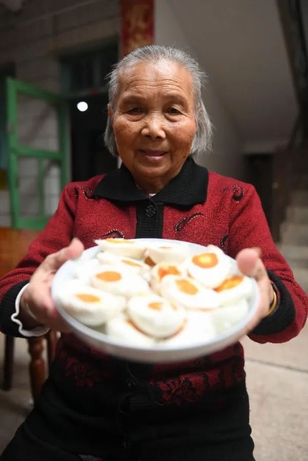 全國脫貧攻堅(jiān)獎(jiǎng)奮進(jìn)獎(jiǎng)獲得者廖秀英老奶奶在贛州瑞金市葉坪鄉(xiāng)鳳崗村家中向游客展示咸鴨蛋 劉青 攝