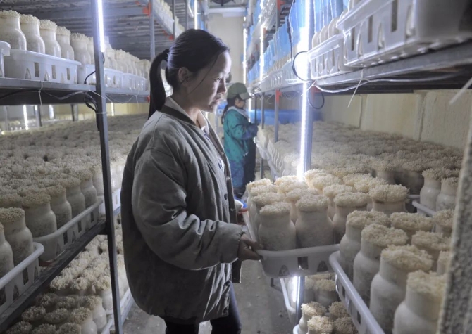 贛州市章貢區(qū)沙石鎮(zhèn)火燃村的貧困戶家庭成員,在扶貧車間低溫環(huán)境下從事蘑菇生產(chǎn),實(shí)現(xiàn)就業(yè)脫貧 李傳材 攝