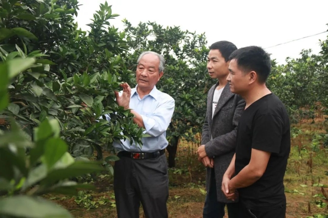 2020年5月23日,贛州市信豐縣大塘長(zhǎng)崗村的客鄉(xiāng)橙園里,“贛南臍橙引種第一人”袁守根(左)在傳授臍橙種植技術(shù) 劉青 攝