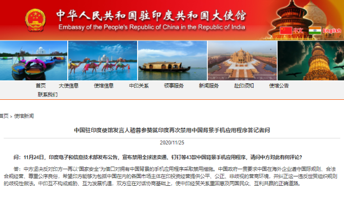 25日中國駐印度大使館發(fā)言人嵇蓉參贊就印度再次禁用中國背景手機應用程序表示,中方堅決反對印方一再以“國家安全”為借口對擁有中國背景的手機應用程序采取禁用措施。