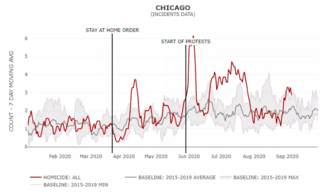 洛杉磯是個(gè)典型,卻不是唯一。據(jù)美國(guó)新聞評(píng)論網(wǎng)站沃克斯(VOX)報(bào)道,自今年美國(guó)暴發(fā)新冠肺炎疫情以來,無論是民主黨還是共和黨領(lǐng)導(dǎo)的城市,兇殺案的數(shù)量都在激增,其中,芝加哥、明尼阿波利斯、密爾沃基、紐約和費(fèi)城等都是兇殺案的高發(fā)區(qū)。