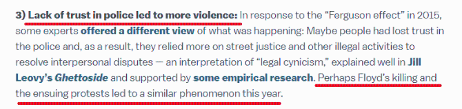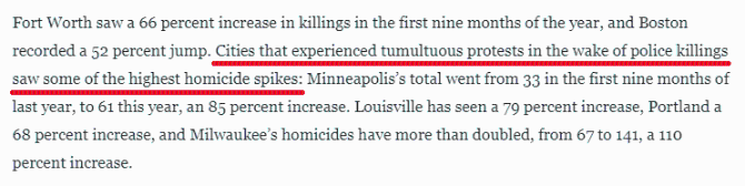 報(bào)道還指出,在那些由警察過度執(zhí)法引發(fā)大規(guī)??棺h的城市,兇殺案也出現(xiàn)激增。今年前9個(gè)月,明尼阿波利斯發(fā)生的兇殺案從去年同期的33起大幅升至61起,增幅達(dá)85%;路易斯維爾的兇殺案增加了79%;波特蘭增加了68%;而密爾沃基暴增110%。