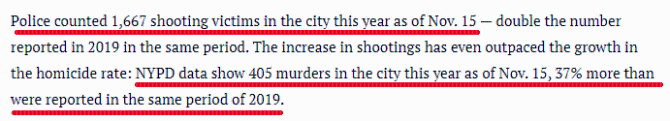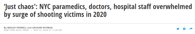 隨著槍支的熱賣,全美涉槍犯罪日益猖獗。警方數(shù)據(jù)顯示,截至11月15日,紐約市今年共發(fā)生405起兇殺案,比去年同期增長(zhǎng)37%;而槍擊案已經(jīng)發(fā)生1667起,是去年同期報(bào)告數(shù)字的兩倍,增幅明顯高于兇殺案。
