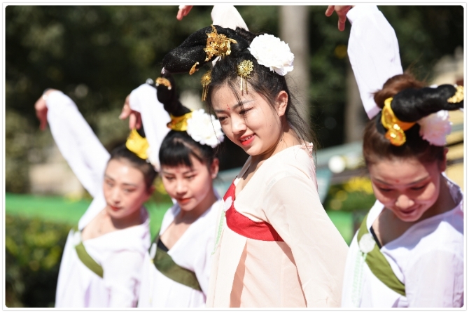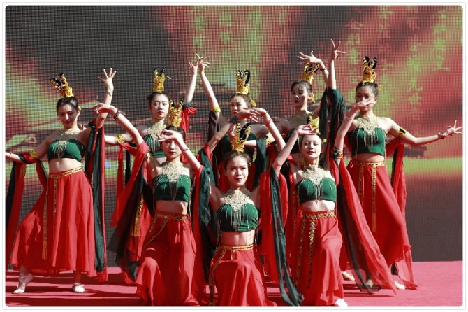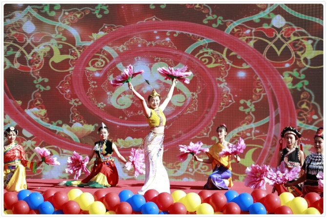 文藝演出一開(kāi)始,激情洋溢的民族歌曲《阿哩哩》把活動(dòng)推向小高潮,民族舞蹈《敦煌飛天》把莫高窟的天高云闊體現(xiàn)得淋漓盡致,藏族舞蹈《歡騰玉樹(shù)》、燈籠舞《大擺裙》、苗族舞蹈《茶山情歌》等節(jié)目輪番上演,吸引了眾多過(guò)往的群眾駐足觀看。