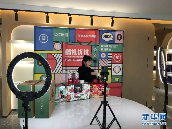 (工作人員正在為石榴、石榴飲品等產(chǎn)品進(jìn)行直播帶貨。 新華網(wǎng) 于楊 攝)