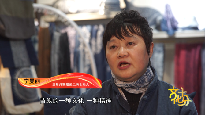 貴州丹寨蠟染工坊創(chuàng)始人 寧曼麗:苗族蠟染它表達(dá)的是苗族的一種文化,一種精神。它的很多的圖案里面都有他們的符號,都有他們的圖騰,有他們五千年遷徙的歷史的印跡,所以苗族它雖然沒有文字,它是把它的文化,把它的歷史穿在身上,繡在身上,畫在身上,刻在身上,寫在身上。