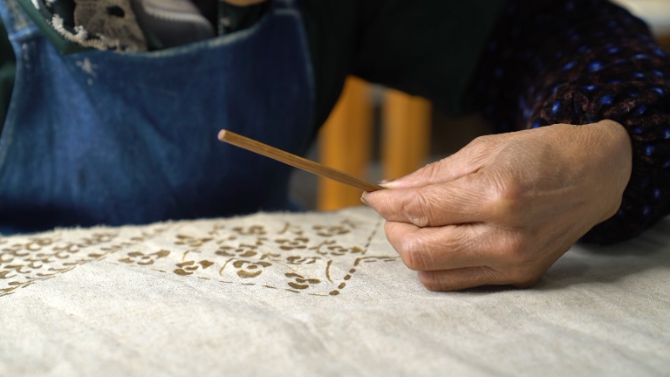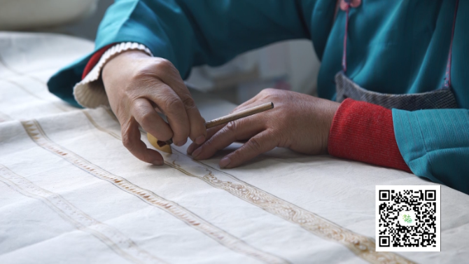 苗族蠟染技藝傳承人 楊乃金:傳說一個(gè)姑娘生病了,就拿那個(gè)草藥擠出來汁液喝,變成那個(gè)藥水,喝了病就好了。苗家人也不知道怎么感謝它,所以畫在衣服上來穿,現(xiàn)在那個(gè)窩妥紋也是由很久以前那個(gè)故事演變出來的。