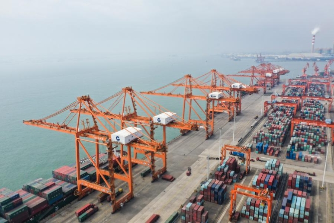 這是中國(廣西)自由貿(mào)易試驗(yàn)區(qū)欽州港片區(qū)的集裝箱碼頭(2019年11月23日攝,無人機(jī)照片)。新華社記者 曹祎銘 攝