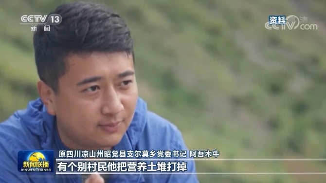 原四川涼山州昭覺縣支爾莫鄉(xiāng)黨委書記 阿吾木牛:每一株苗子下面有一個20來斤的營養(yǎng)土堆,有個別村民他把營養(yǎng)土堆打掉,只把枝枝背上來。