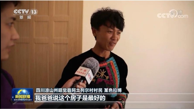 四川涼山州昭覺縣阿土列爾村村民 某色拉博:我爸爸說這個房子是最好的,接下來的生活,我的孩子就不用爬山了,再等孩子長大了以后,我跟老婆就到懸崖村的旅游公司上班。