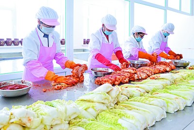 如今,金達萊村的元池辣白菜是遠近聞名的品牌。在元池蔬菜有限公司,幾十名工人正忙著洗白菜、抹辣椒、密封。相關負責人介紹,辣白菜的銷路很好,通過線上線下兩種渠道,產品銷售到上海、北京、青島等城市,供不應求。