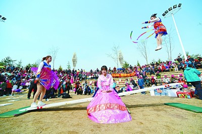 金達萊村村民為游客表演朝鮮族民俗“跳蹺蹺板”。