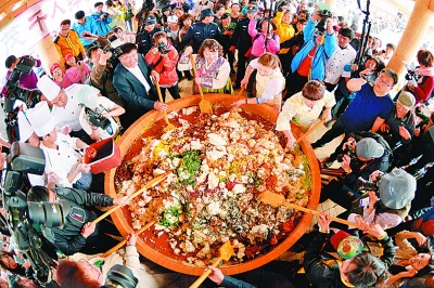 在金達萊村舉辦的大型朝鮮族美食制作活動“千人拌飯”。