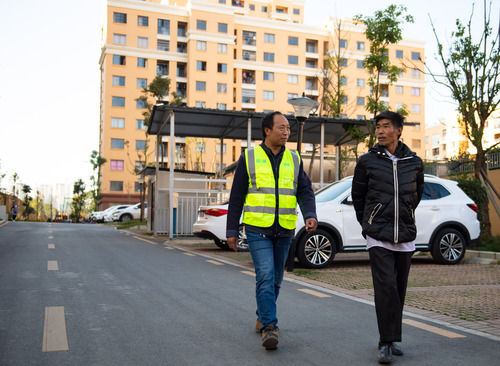 馮登友(左)在云南省鎮(zhèn)雄縣魯家院子易地扶貧搬遷安置點(diǎn)巡邏時(shí)與搬遷群眾聊天(11月10日攝)。新華社 記者王冠森/攝