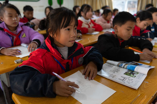 云南省鎮(zhèn)雄縣以古鎮(zhèn)巖洞腳九年一貫制學(xué)校的孩子們在上課(11月11日攝)。新華社 記者王冠森/攝