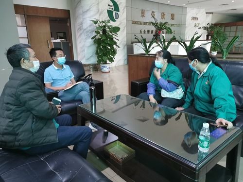 鎮(zhèn)雄縣駐廣東省東莞市清溪鎮(zhèn)勞務(wù)輸出工作站站長張勇(左二)在清溪鎮(zhèn)一家企業(yè)走訪鎮(zhèn)雄籍務(wù)工人員(4月24日攝)。新華社發(fā)