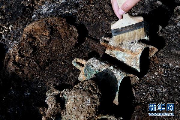 工作人員在清理河南洛陽徐陽墓地標(biāo)號(hào)為M15的墓葬出土的編鐘(11月27日攝)。新華社記者 李安/攝