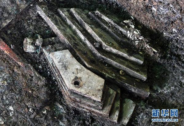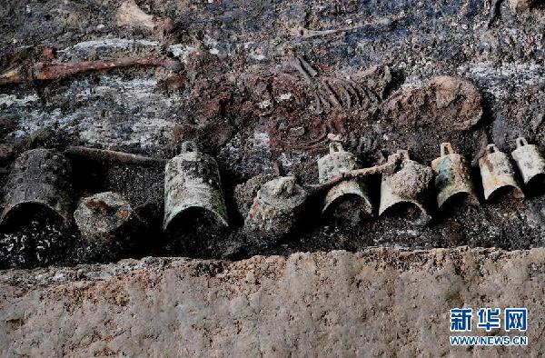 這是河南洛陽徐陽墓地標(biāo)號(hào)為M15的墓葬出土的編鐘(11月27日攝)。新華社記者 李安/攝