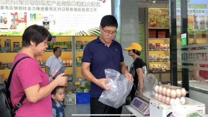 廣州市民紅姐(左一)正在番禺區(qū)石碁供銷社購買赫章雞蛋