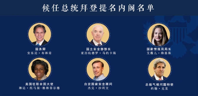 這次獲得提名的6人分別是:安東尼·布林肯擔任美國國務卿,亞歷杭德羅·馬約卡斯擔任美國國土安全部部長,艾薇兒·海恩斯擔任國家情報局局長,杰克·沙利文擔任白宮國家安全顧問,琳達·托馬斯-格林菲爾德?lián)蚊绹v聯(lián)合國大使,約翰·克里擔任總統(tǒng)氣候問題特使。