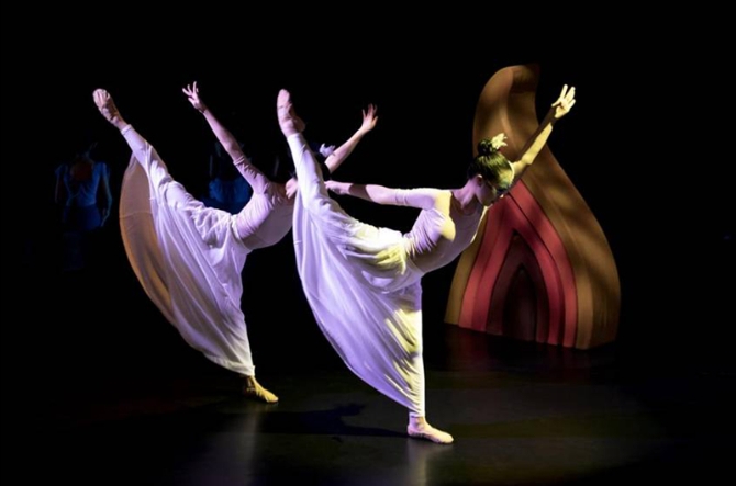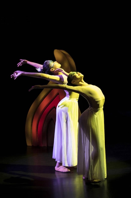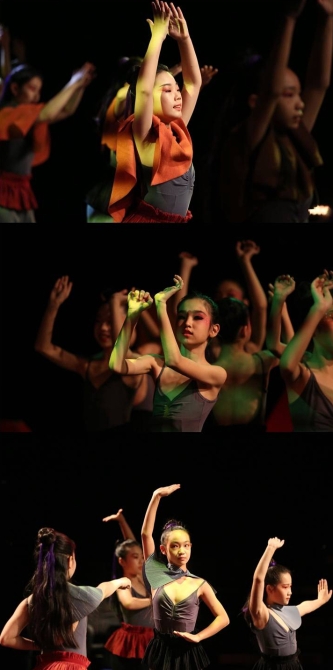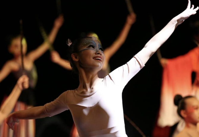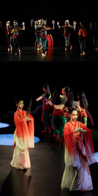 兒童劇《比翼鳥(niǎo)》藝術(shù)教育實(shí)踐項(xiàng)目中期匯報(bào)活動(dòng)由一堂生動(dòng)的傳統(tǒng)文化課展開(kāi),主要講述了生活在崇吾山中的比翼鳥(niǎo),在洪水將至之時(shí)救助崇吾村村民的故事。由家園、出走、祈神、重建、祈福五部分組成,通過(guò)“不比不飛”的比翼鳥(niǎo)雙人舞開(kāi)始上古神話(huà)的講述,在《家園》章節(jié)以古代樂(lè)舞長(zhǎng)袖舞和武舞的風(fēng)格展現(xiàn)了崇吾村的祥和安寧;第二章節(jié)《出走》中,洪水將至,暴雨導(dǎo)致河床上漲,村民們四處輾轉(zhuǎn)向高處轉(zhuǎn)移,最后在比翼鳥(niǎo)的指引下,大家安全搬離到崇吾山;第三章節(jié)《祈神》中,村民們?cè)诔缥嵘缴线b望著家園的方向跳起了巫舞來(lái)祈求神靈的保佑;第四章節(jié)洪水退去,崇吾村的村民們齊心協(xié)力《重建》家園,大家在歡愉之中載歌載舞,面向崇吾山的方向,以最高之禮《羽舞》來(lái)感謝比翼鳥(niǎo)舍己為人大無(wú)畏的精神,更祈福天地長(zhǎng)壽五谷豐登。