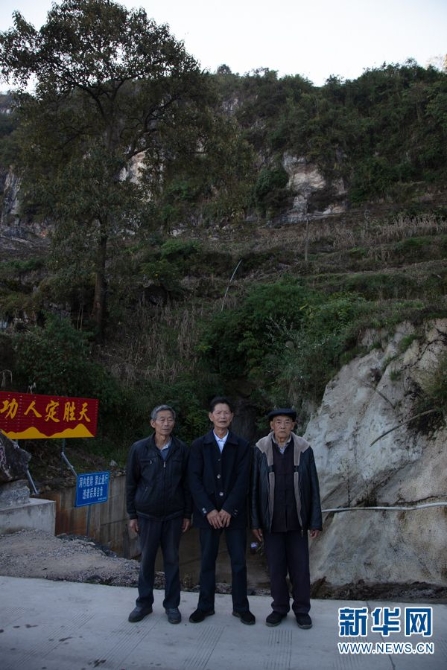 參與開鑿勝天洞的劉學(xué)廣、劉文政、劉學(xué)漢在洞口(11月19日攝)。新華網(wǎng) 羅春明攝