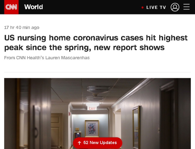 △CNN報道,最新報告顯示,美國養(yǎng)老院新冠肺炎確診病例創(chuàng)春季以來最高
